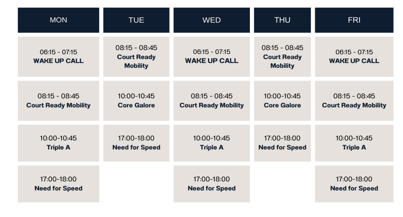 A morning boot camp–style functional fitness session to kickstart your day. This class combines strength, conditioning, agility, and full-body training. Perfect for all fitness levels—including non-tennis players.